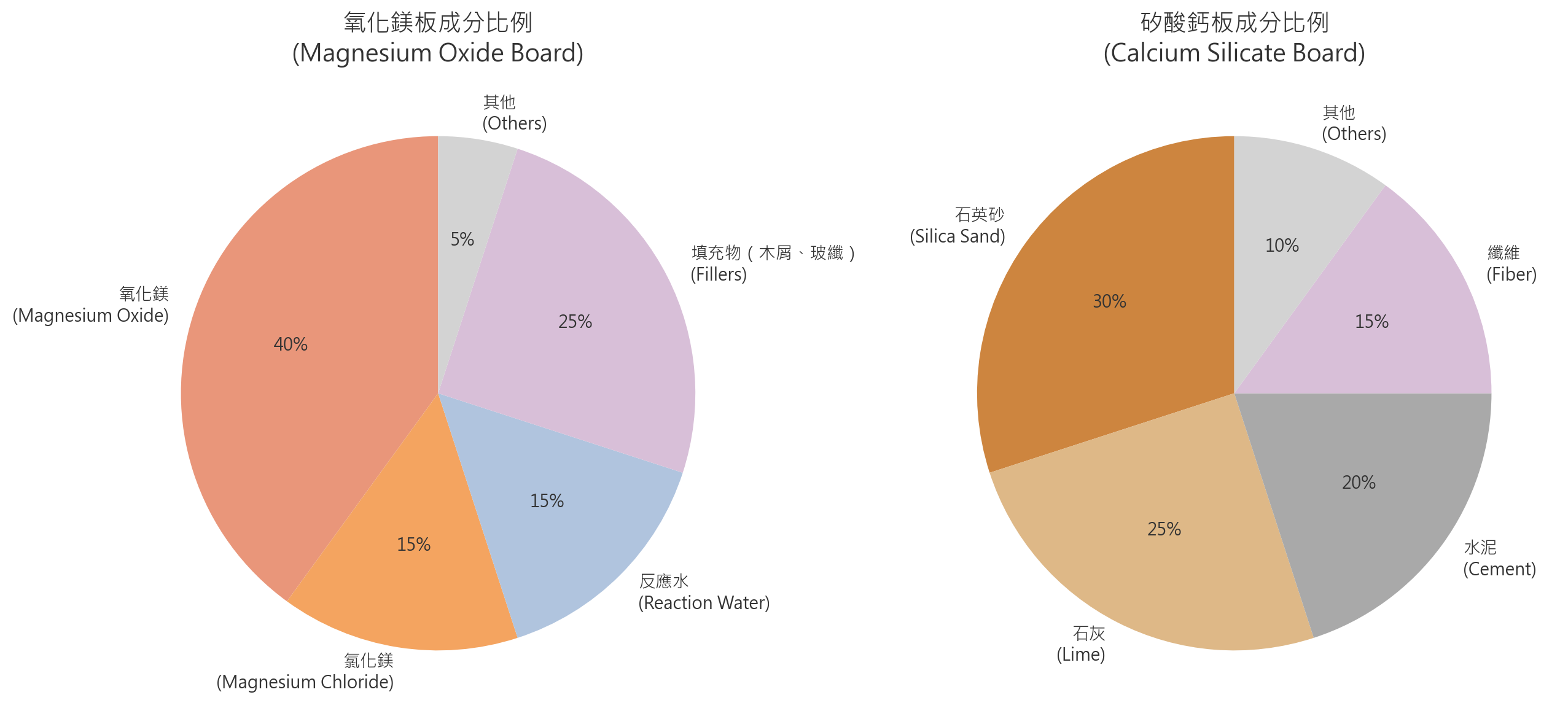 矽酸鈣板(Calcium Silicate Board):由石英砂、石灰、水泥、纖維等原料混合,經高溫蒸壓處理後形成結晶結構。(資料來源:MATEC Conf. – 矽酸鈣板吸濕與熱特性研究)