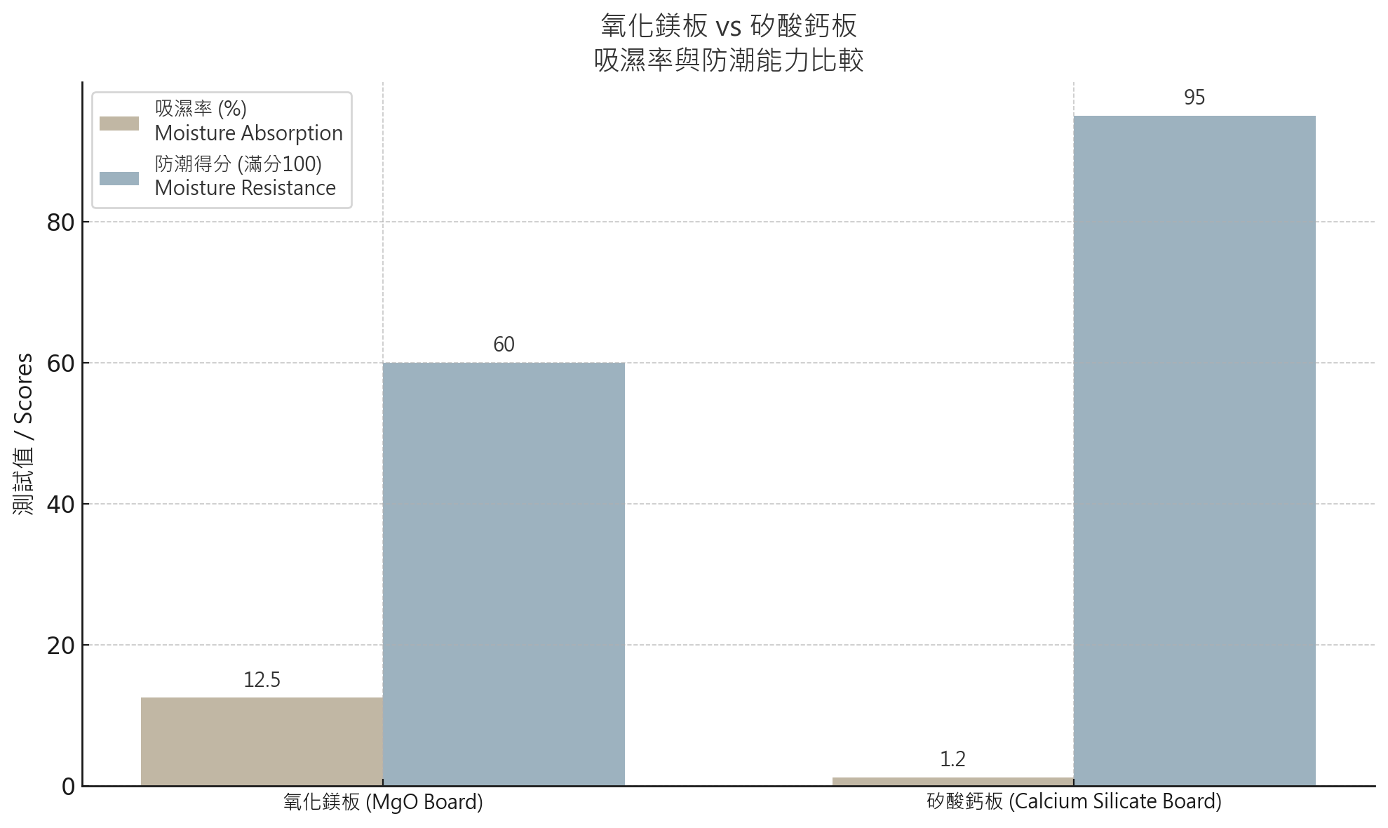 矽酸鈣板:防潮性能優異,適用於浴室外牆、廚房、天花板等高濕環境。(資料來源:SanleBoard – 濕環境下的矽酸鈣板性能)